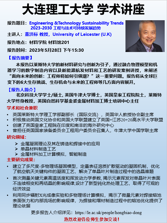 董洪标 教授,北京科技大学学士/硕士,英国牛津大学博士,英国皇家工程 院院士,莱斯特大学终身教授,英国自然科学基金委金属材料加工博士培训中心主任。