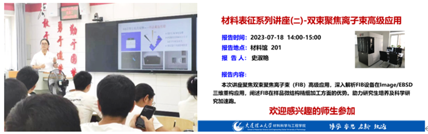 第二期内容为双束聚焦离子束高级应用。史淑艳老师通过自己多年的实验教学与研究经验,在本次讲座中为大家深入解析了双束聚焦离子束(FIB)设备在Image/EBSD三维重构应用,阐述FIB在样品微结构精细加工方面的优势,同学们受益颇深。