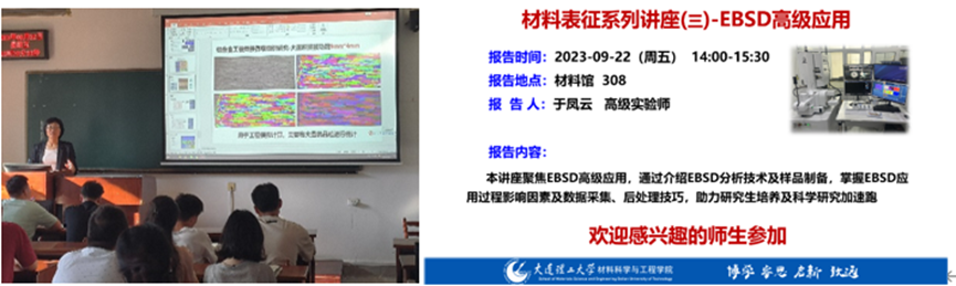 第三期内容为EBSD高级应用。于凤云老师通过介绍EBSD分析技术、样品制备、数据采集影响因素、数据后处理及应用,让同学们更加深入的了解了EBSD技术,有效结合课题可以开展相关应用。