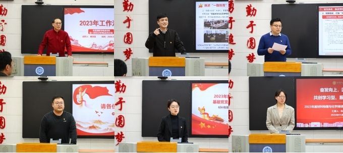 各党支部聚焦2023年度党建重点任务和推进“一融双高”建设情况、以及支部查摆问题整改情况、存在问题改进思路进行了总结。公司党委对照年初各支部提交《2023年基层党支部“一融双高”工作推进计划表》,在年末形成《2023年度党支部考核重要业绩指标一张表》,对支部工作进行督导。6名党支部书记进行现场述职,很好地展示了一年来支部以高质量党建引领公司高质量发展的良好势头。金属凝固与电磁控制第一研究生导师纵向党支部,面向青年教工,开启“薪火相传”活动扎实推进有组织科研,面向研究生,持续探索赛教融合育人模式。轻合金电磁改性研究生导师纵向党支部开创“党建文化与交叉学科创新培养融合”等系列特色活动,促进思政育人和科研攻关等融合建设;本科生辅导员纵向第三党支部努力打造“3+3+3”支部建设计划,建设乐于志愿、服务学科发展、创新争优的战斗堡垒;生物医用材料及智能材料博硕员工党支部持续六年如一日开展定期阅读好书分享,扎实提升党员团员理论水平;材料物理与化学博硕员工第一党支部持续开展志愿活动,接力大连站/大连北站节假日铁路志愿活动,支部全年志愿时长200+;材料物理与化学博硕员工第二党支部以“广度学习、深度思考、效度衡量”推动新拆分支部建设打下良好的基础。
