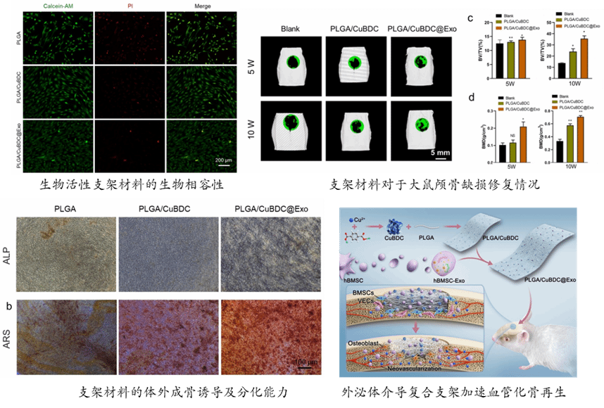 随着人口老龄化的加剧,骨缺损和骨折已成为威胁人类健康、影响生活质量的重要因素。目前,作为改善骨修复的“金标准”,骨移植仍不能满足临床需求。近年来,组织工程学、材料学和再生医学等多学科领域的交叉融合为骨缺损修复研究提供了新的契机。徐畅博士在齐民教授和董旭峰教授的共同指导下,利用金属有机框架材料(Metal-organic framework, MOF)修饰的聚合物支架用于外泌体的负载和释放,使其支架材料由“生物惰性”到“生物活性”的转变,进而实现骨缺损的有效修复。该复合支架对外泌体具有高负载率,且随着支架材料的缓慢降解,实现外泌体和铜离子的双重稳定释放。体外细胞实验验证该支架材料优异的生物相容性、成骨诱导性及血管生成能力;利用体内动物实验进一步验证该活性支架具有优异的成骨-成血管耦合性能。