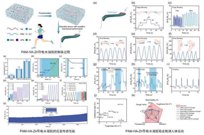 关世强硕士针对基于导电水凝胶的应变传感器难以在优异力学性能、传感性能与其他适用功能性(如粘附性、透明度等)之间取得良好平衡,从而限制其日常生活应用的问题,设计了PAM-HA-Zn导电水凝胶材料。该材料实现了力学性能、传感性能与功能性之间的平衡。得益于水凝胶材料本身较大的断裂延伸率,该传感器具有宽的工作范围。同时,该导电水凝胶材料还表现出快响应速度、较高灵敏度、低至1%的应变检测限以及良好的稳定性和重复性。其能够在实际应用中稳定检测人体应变,为人体运动传感器的开发提供了一种优异的候选材料。