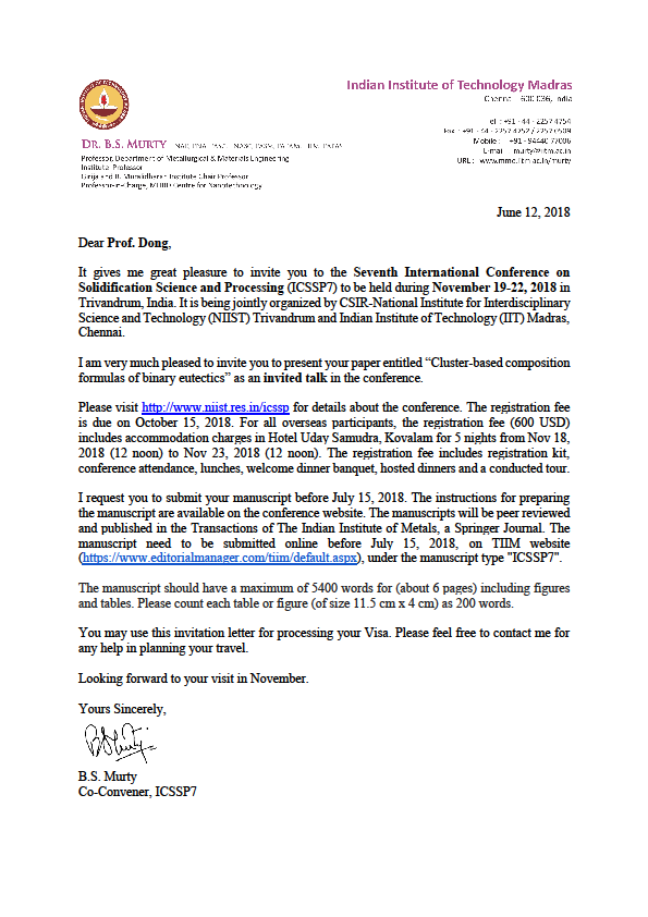 邀请人:B.S. Murty, Co-Convener; Professor inDepartment of Metallurgical and Materials Engineering, Indian Institute of Technology Madras(会议召集人;金奈马德拉斯印度理工公司(IIT)冶金与材料工程系教授)