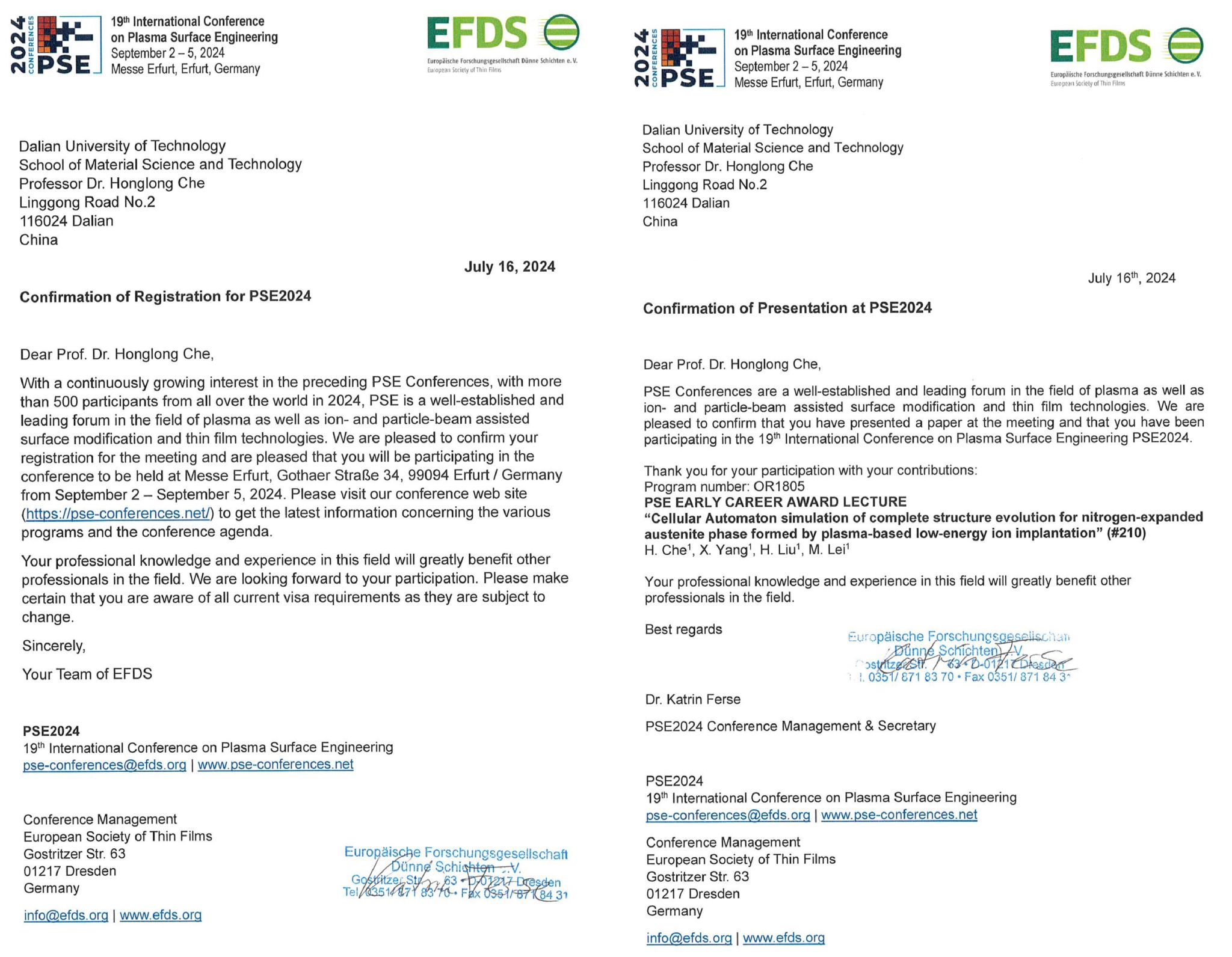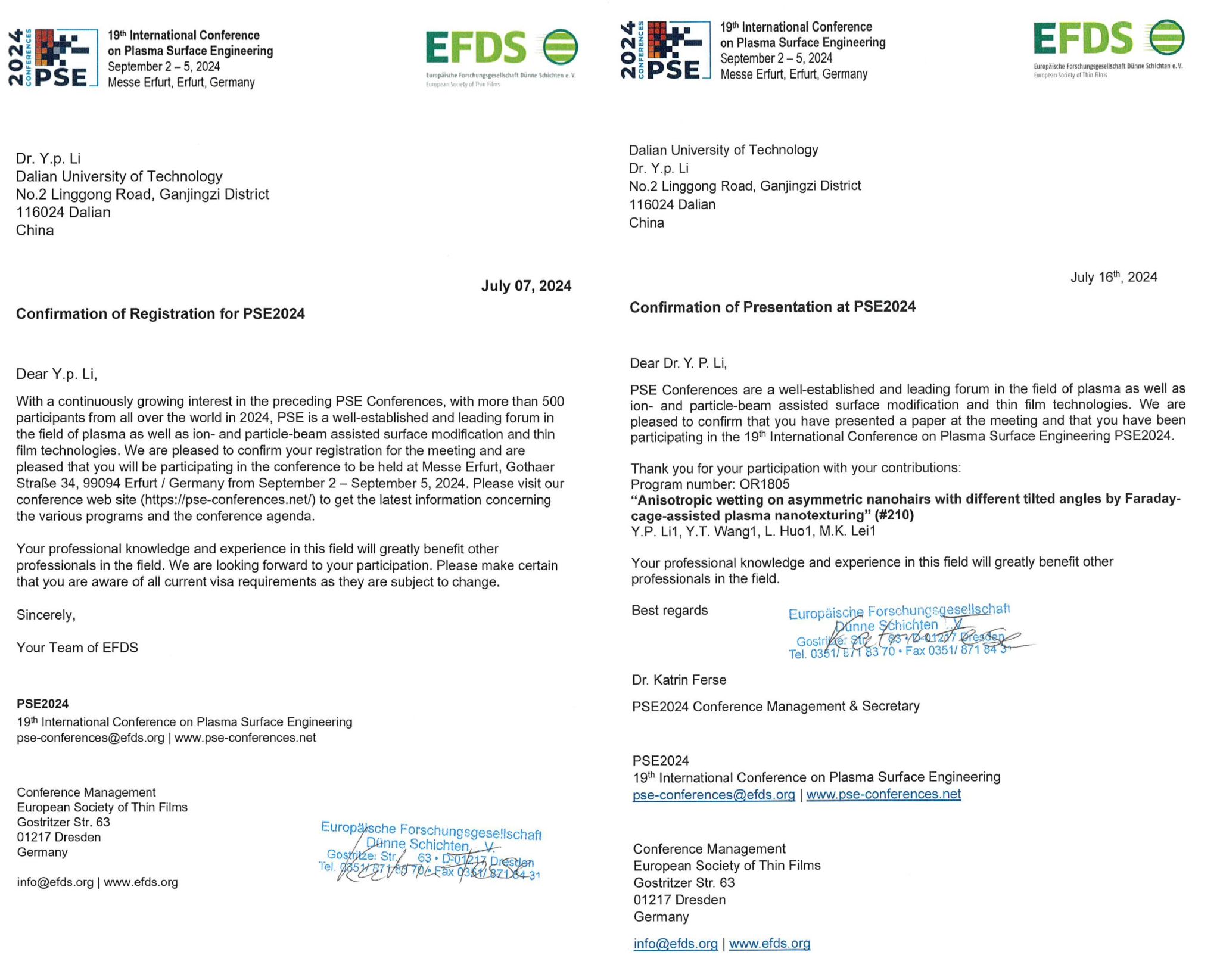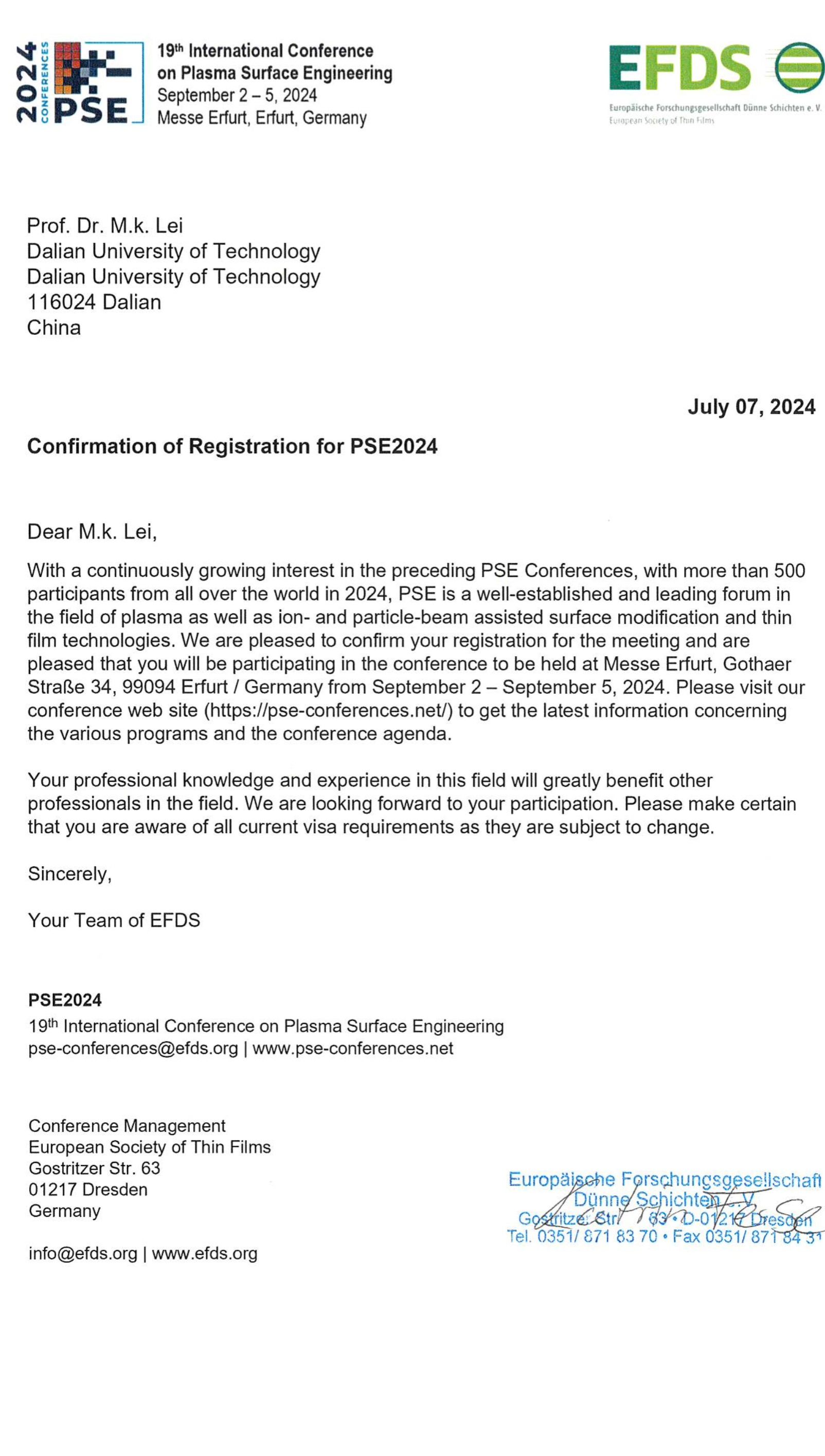 应PSE2024 Conference Management&Secretary邀请,我单位雷明凯等拟赴德国参加国际学术会议。现将该团组拟出访情况公示如下: