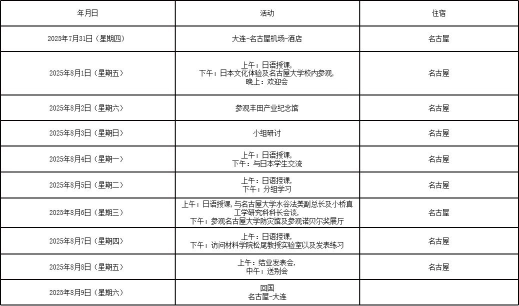 2025年7月31日至8月9日,由DB旗舰董伟副教授(团长)带队,赴日本参加名古屋大学举办的暑期日本语研修班。出访团成员包括董伟副教授、程从前副教授两位教师,以及2024级DB旗舰金属材料工程(中日精英班)本科生马智轩、李奥迪、余娅苹、鲍金闪、张家豪、马犇、高歌、林旭、宋煜晨、张佳运、谭洪东、彭湃、孔泽辰、李博等14名同学,共计16人。这是金属材料工程(中日精英班)专业本科员工首次以集体形式出国参加日语培训,得到了公司及国际合作处的大力支持。