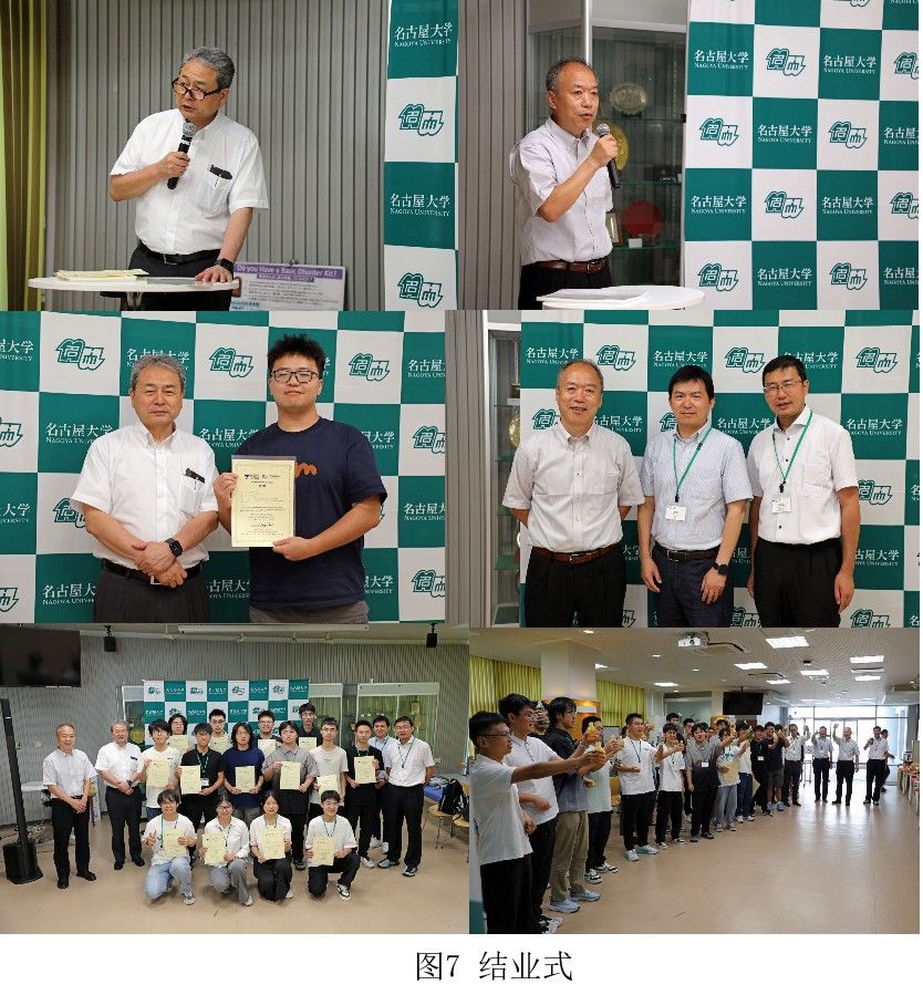 发表会结束后,举行了结业仪式(见图7)。名古屋大学副总长水谷法美为全体学员颁发结业证书,并对同学们的表现表示赞赏。马智轩同学作为员工代表领取证书并发言,董伟副教授也代表教师致辞,感谢名古屋大学的悉心安排。
