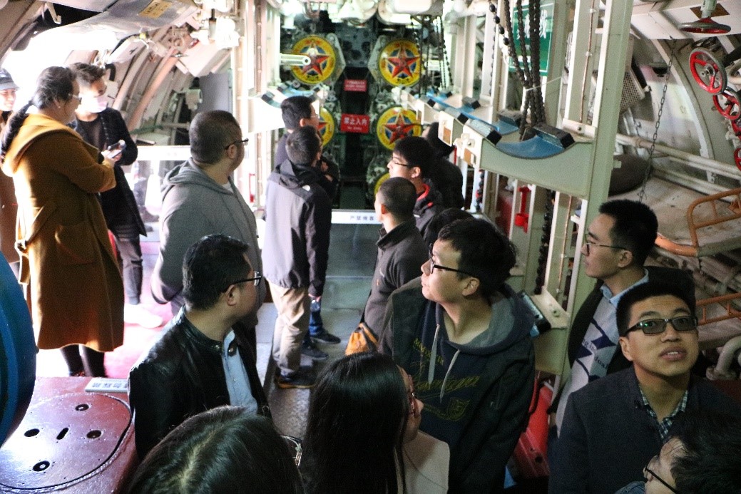 最后,同志们登上了已退役的33型潜艇,据介绍,狭窄的空间内,除去一半的空间用于机器、仪器,余下的空间还要容纳60-70人,即使艇员按三更制轮流值更和休息,仍有许多官兵睡在地板和通道上。而在炎炎夏季,舱内温度高达50多度,官兵穿着背心、短裤仍然汗流浃背。了解到这些,党员同志们感知到军人为保卫国家而付出的艰辛,也意识到如今强大的祖国离不开那些默默奉献、负重前行的军人。