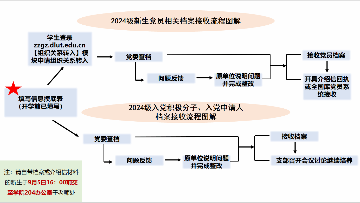 现开展2024级新生党员组织关系转入及入党申请人、入党积极分子接收培养工作。请大家在截止时间前按要求认真完成,整体工作流程如下。