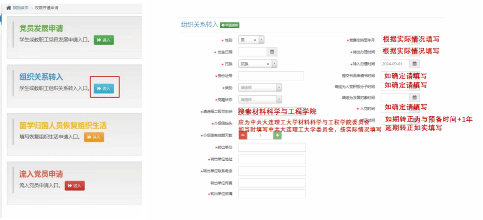 1、申请组织关系转入。9月3日17点前,登录公司组工一体化平台(网址:zzgz.dlut.edu.cn),并填写相关信息,具体操作页面见图例。在职定向生无需转组织关系。