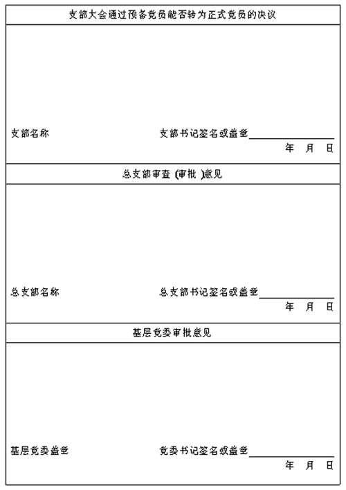 17.“支部大会通过预备党员能否转为正式党员的决议”,填写预备党员在预备期间的思想、学习、工作等方面的表现情况,指出其存在的缺点和今后努力的方向,写明支部党员大会表决的情况。